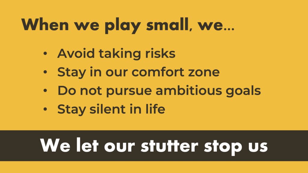 Too many people who stutter choose to “play small” in life. We choose not to be outgoing, assertive, and gutsy. Instead, we allow our fears, insecurities and low self-worth dictate our life decisions.